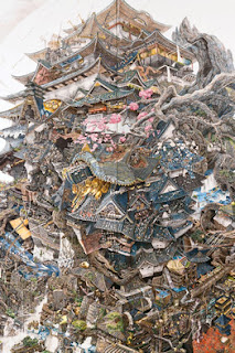 Book Marks seemed deceptively simple at first - library cards for each book she had read. Closer examination showed that each card had been altered to depict the book it was representing. For example, a book about birds of New Zealand had bird postage stamps on it, a book about architecture showed a floor plan, or as she puts it, "remnants from the library of the mind." The vaguely sad part of the work was the fact that library book cards are now considered ephemera. As we proceed into the Kindle Era, perhaps physical books themselves will become ephemera. Take a look at